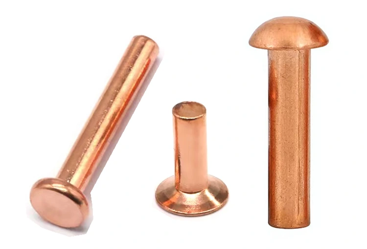 Il colore dei rivetti in rame è principalmente rosso porpora o rosso, una caratteristica delle loro proprietà materiali. Essendo un materiale di rame di elevata purezza, il colore del rame tende al rosso più scuro man mano che aumenta la sua purezza. Nell'uso effettivo, il colore dei rivetti in rame può variare a seconda del trattamento superficiale, dell'ambiente operativo e del tempo. Ad esempio, dopo un uso prolungato o l'esposizione all'umidità, sulla superficie del rivetto in rame potrebbe formarsi una pellicola di ossido che ne scurirà il colore.